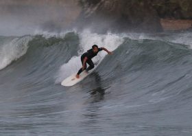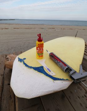 4:30PM... repairing ... H.H.N.R ショアブレイクで破損したノーズ部分を テキトウに切って削って 剥き出しになった中身の発泡スチロール?を 木工用ボンドと変成シリコ ... MORE