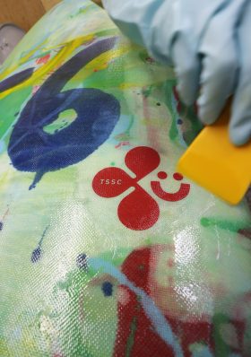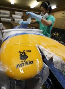 MADE by HAND。。。 ▪️ FATRATは、きょうラミネートの工程に移りました。 巻かれたクロスは6オンス、その上に手際よく樹脂が流されていき、 ロゴとキャラクターもカッコよく収まりました。 ... MORE